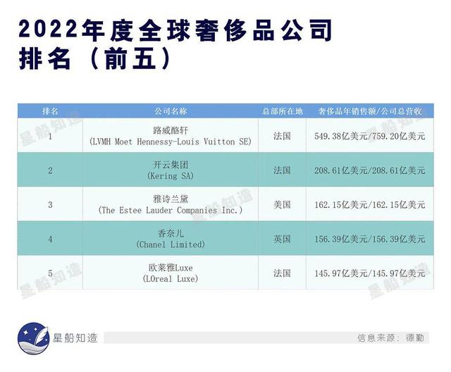 2022年全球奢侈品公司排名前五中,法国占三席。还不包括因架构重组而成为了一家英国公司的法国奢侈品代表香奈儿。