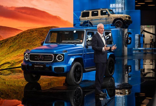 4月25日,在北京中国国际展览中心顺义馆举行的2024北京车展上,梅赛德斯—奔驰集团股份公司董事会成员唐仕凯介绍梅赛德斯—奔驰纯电G级越野车。新华社记者 才扬 摄